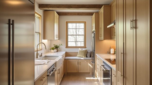 The details in Pittsburgh's older homes are assets, not problems. Wide window casings. Hardwood floors. Chunky wood trim around the doorways. A good designer builds the kitchen around those things, not over them. Shaker-style cabinets work well here because the look is simple. Warm whites, creamy off-whites, and deep greens tend to feel right without fighting the original details of the house.